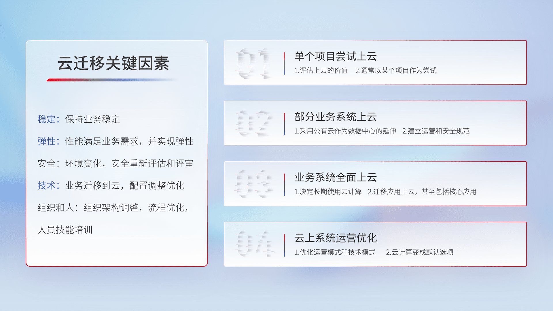 结合实际业务,,从规划设计、、、、云平台选型、、云原生改造、、、、数据迁移、、、、集成交付,,,迁移全过程为客户识别最佳上云路径,,,做好风险识别管理,,,设计网络架构、、身份权限、、安全审计合规、、操作审计、、日志审计、、、、监控告警策略、、多站点容灾设计等,,,,对云上基础设施进行整体规划,,提升IT治理水平,,以满足弹性、、、高可用、、、高性能的需求。。